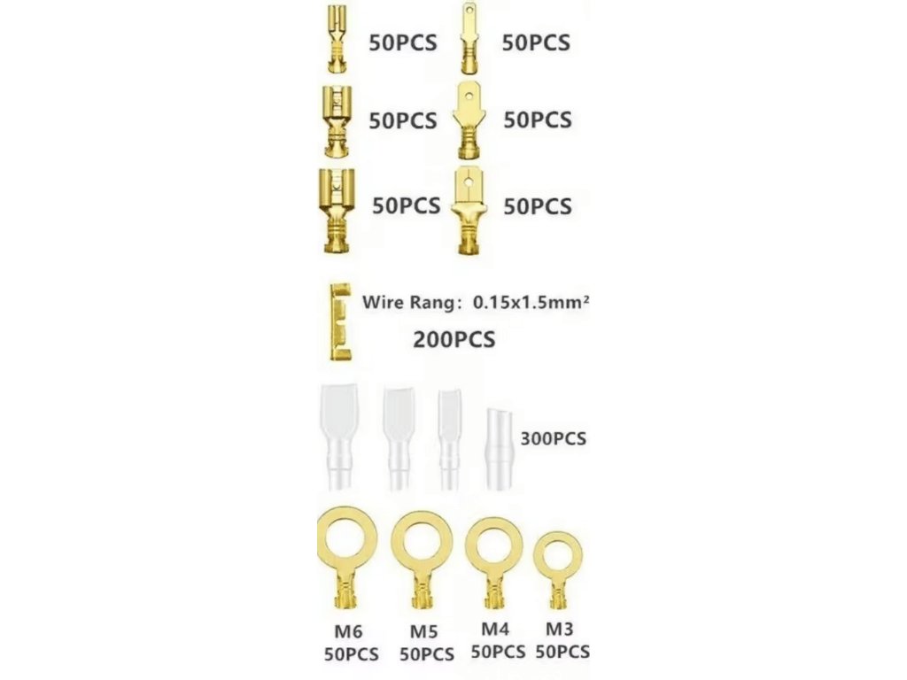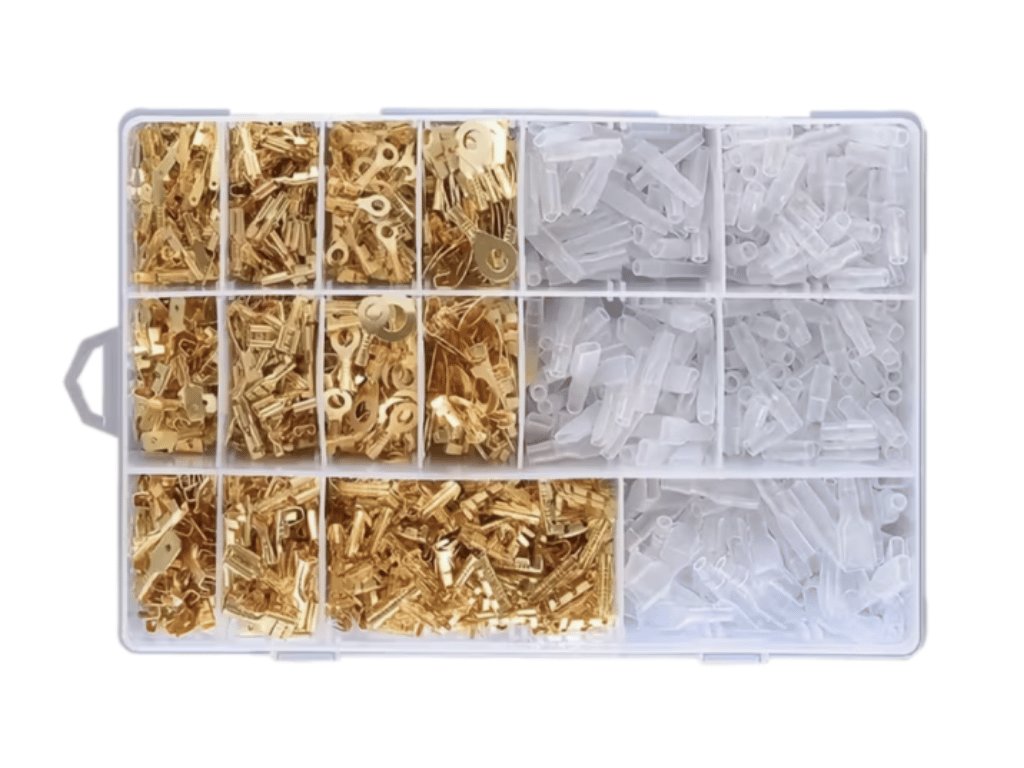 Tato rozsáhlá sada obsahuje 1000 dílů pro komplexní elektroinstalační práce v dílně, automobilu nebo při opravách domácí elektroniky. Balení kombinuje nejpoužívanější typy plochých konektorů (samce i samice), očková oka M3–M6 a speciální krimpovací spojky pro přímé napojení vodičů.